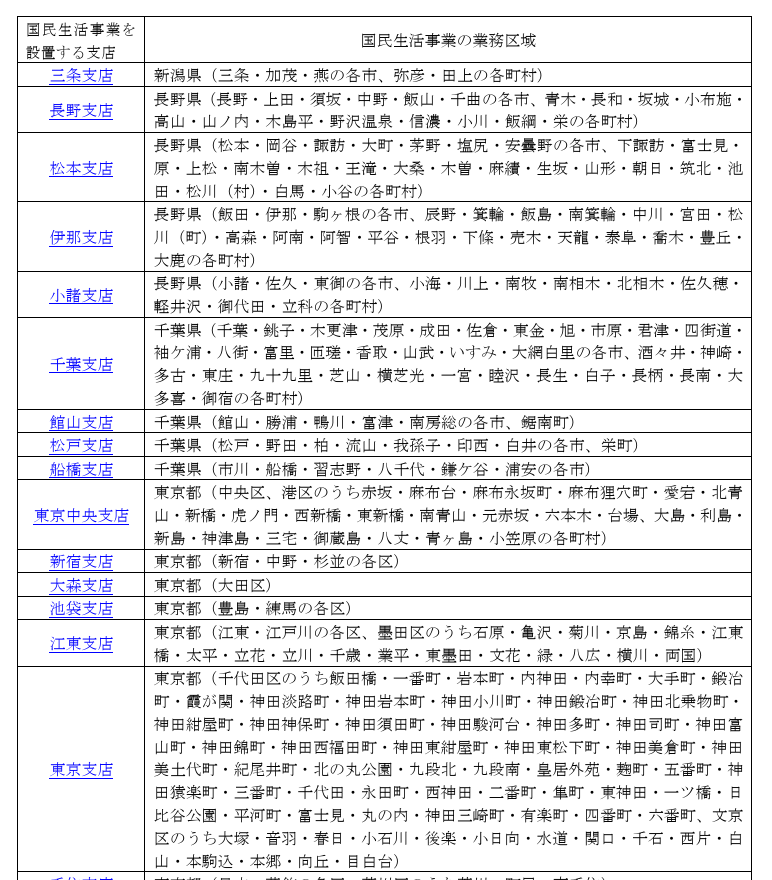 | 東京中央支店 | 中央区、港区のうち赤坂・麻布台・麻布永坂町・麻布狸穴町・愛宕・北青 山・新橋・虎ノ門・西新橋・東新橋・南青山・元赤坂・六本木・台場、大島・利島・ 新島・神津島・三宅・御蔵島・八丈・青ヶ島・小笠原の各町村 |