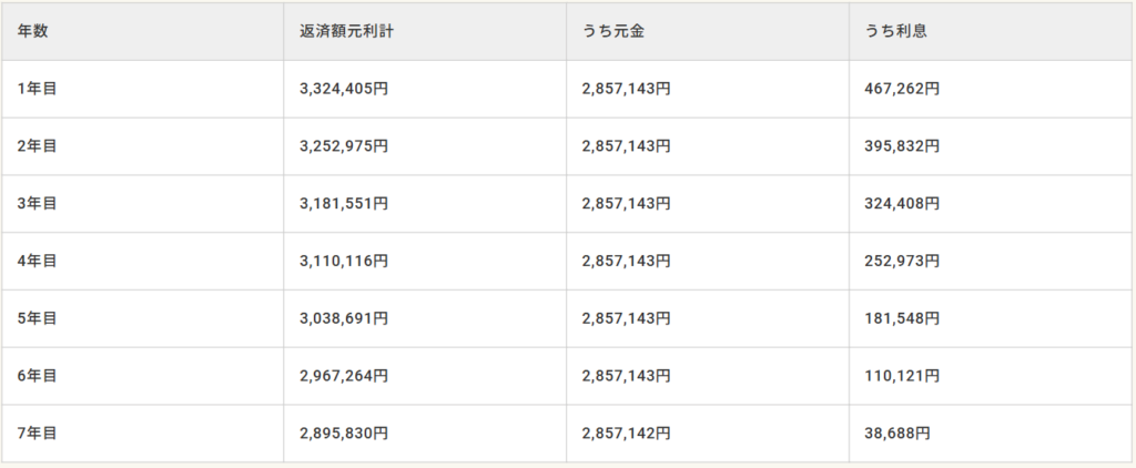 例えば、2000万円を金利2.5%、7年間で返済する場合、毎年の返済額の目安は約3,300,000円となります。